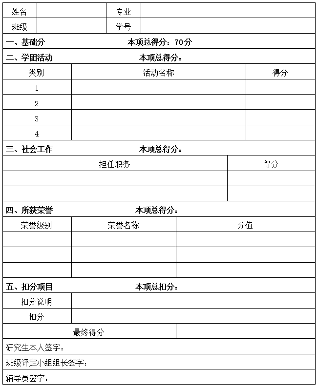 永利集团3044欢迎光临研究生学业奖学金德育成绩评分表