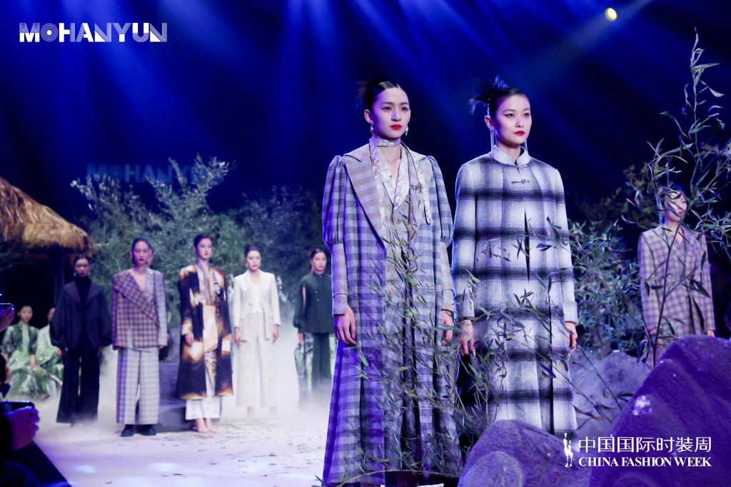 整场发布会以远古自然的笔触,演绎当代年轻人返璞归真的初心。作品延续了MoHanYun品牌一贯低调致雅的风格,着眼于服装肌理脉络矜持的呈现性格,直指当代迷幻青春的痛点。在采用低饱和颜色的同时,加入了一些春绿和乳白,将悸动又自然的心境融合在格纹和石纹中,将青丘山脉迷谷肌理通过“S”型波浪曲线的排列感呈现。用摩登科技与中式典雅的虚实相生,重新解读新生一代理解国潮的入口。