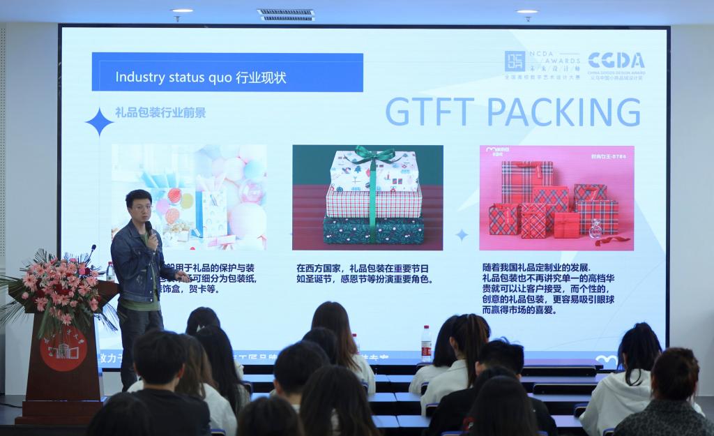 义乌市中国小商品城商会旗下三家公司代表作创新创业赛道推广介绍。义乌中国小商品城创意设计发展服务有限公司副总经理王佐龙对义乌中国小商品城和产教融合小商品设计创新服务体系作了推广介绍;义乌市中国小商品城商会礼品包装行业商会会长单位——义乌米凯伦文化用品有限公司总经理金建华对场景化、个性化包装进行宣传;浙江斍牌创意设计有限公司设计总监喻文力在讲座中分析了当下文具市场趋势,提出主题化、故事化、网络化和风格化的文具文创方向。