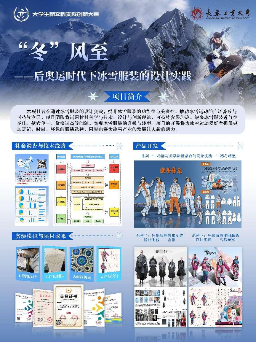 本项目根植于吉林省得天独厚的丰富冰雪资源,深入后奥运时代下冰雪运动生活,运用艺术学、人文社会科学及自然科学知识与方法,开展面料理论研究、文化创意设计,聚焦冰雪运动创意功能服饰研发,传承弘扬中华优秀传统文化,体现了独特的创新设计思维,展现了中华文明时代的新气象。