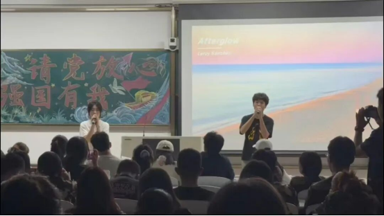 随着 11 号选手的演讲落下最后一个音节,王一诺学姐与金圣皓学长登台,演唱歌曲《虹之间》,进一步展现公司学子的综合素养,缓解赛场紧张氛围,将赛场氛围烘托至高潮。